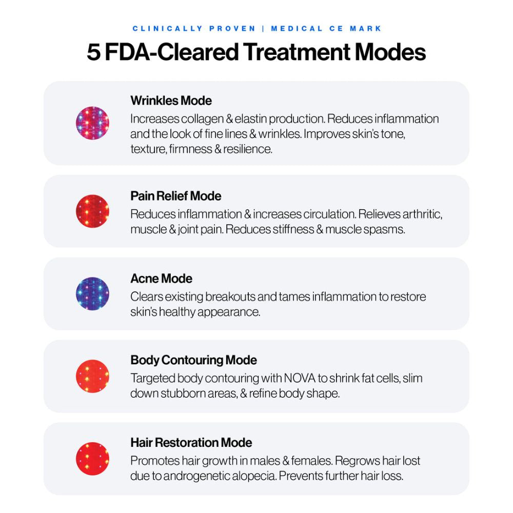 The All-New NOVA—a compact 5-mode, battery-powered LED light therapy panel. FDA-cleared for hair growth, aging skin, pain management, body contouring, and acne. Maximum versatility, portability, and targeted treatment for any part of the body.